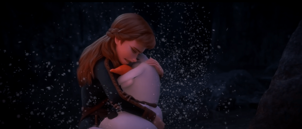 I believe the filmmakers ultimately failed in this though. Olaf never really changes or develops, despite putting on that show. His death is still sad, but it’s because we understand that Olaf’s death means Elsa’s death. As I wrote in this post: “It’s a cruel moment in the movie, when the object of [Anna’s] unshakeable love and faith isn’t even there, and Anna can only express her love by proxy.” Olaf is the proxy for Elsa, and though he loves Anna deeply on his own accord, we know that Anna is grieving both Olaf and Elsa. In this way, he ends up still being Elsa’s “heart” in avatar form.